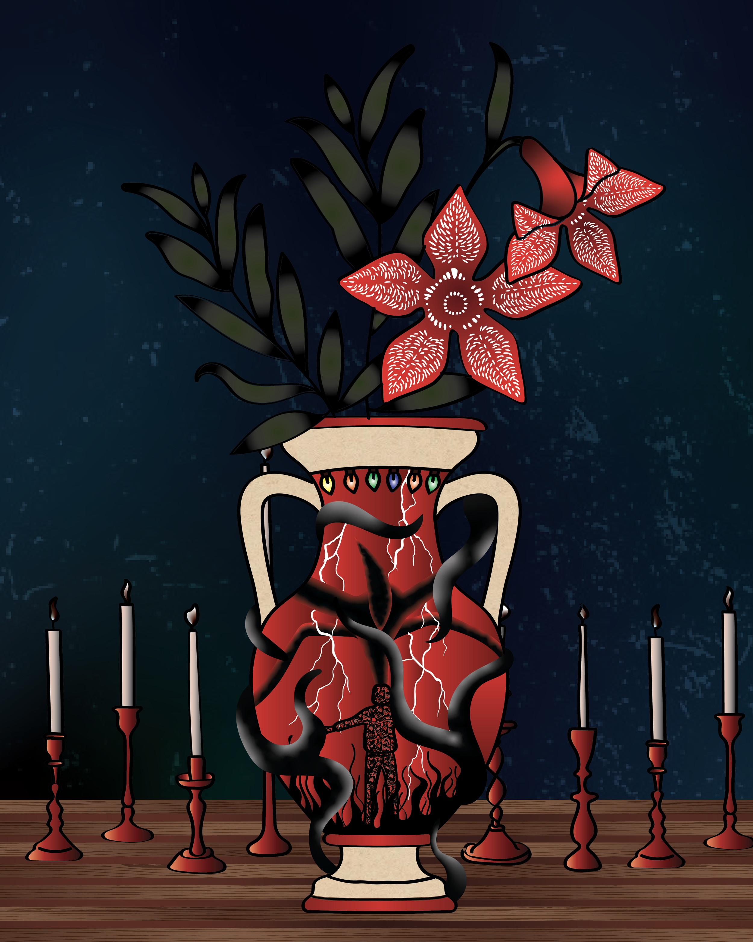 Stranger Things, where iconic characters bloom through playful floral and vase design